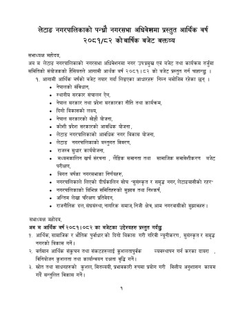 लेटाङ । लेटाङ नगरपालिकाले आगामि आर्थिक वर्ष ०८१/०८२ का लागि ६० करोड ८५ लाख ३७ हजारको बजेट ल्याएको छ । आज सोमबार बसेको नगरपालिकाको पन्ध्रौं नगरसभामा नगर बजेट तथा कार्यक्रम तर्जुमा समिति संयोजक तथा उपप्रमुख कृष्णकुमारी निरौलाले ६० करोड ८६ लाख ३७ हजार रुपैयाँको बजेट प्रस्ुतत गर्नुभयो । उपप्रमुख निरौलाले प्रस्तुत गर्नु भएको बजेटमाथि नगरसभा सदस्यहरुले धारणा राखेपछि बजेट सर्वसहमतिमा हुबहु पास भएको छ ।