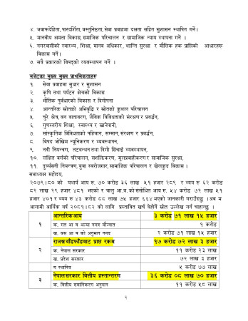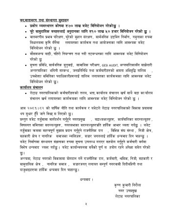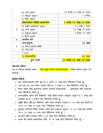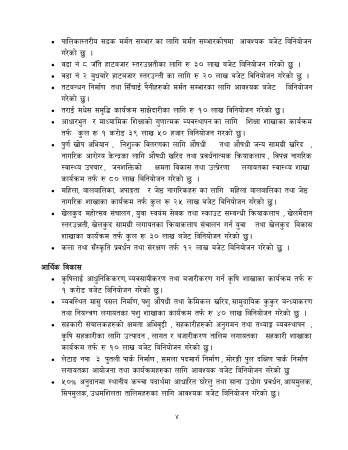 यस्तै शिक्षा शाखाका कार्यक्रमतर्फ १ करोड ३९ लाख ५० हजार, स्वास्थ्य शाखाका कार्यक्रमतर्फ ८० लाख, महिला बालबालिका तथा जेष्ठ नागरिक शाखाका कार्यक्रमतर्फ २५ लाख, युवा तथा खेलकुद विकास शाखाका कार्यक्रमतर्फ ३० लाख, कृषि शाखाका कार्यक्रमतर्फ १ करोड, पशु शाखाका कार्यक्रमतर्फ ४० लाख, सहकारी शाखाका कार्यक्रमतर्फ १० लाख र प्रकोप व्यवस्थापन कोषमा ७० लाख विनियोजना गरिएको छ । (फोटो : दिपेश खतिवडा)