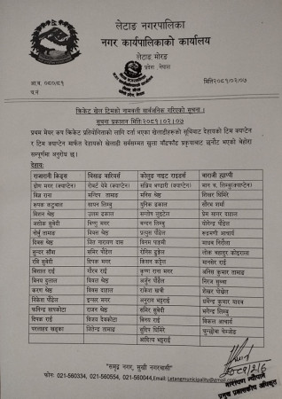 लेटाङमा नगरपालिकाको आयोजनामा पहिलो पटक क्रिकेट प्रतियोगिता सञ्चालन हुन लागेपछि क्रिकेट खेलाडीहरु र क्रिकेट प्रेमीहरु उत्साहित भएका छन् ।