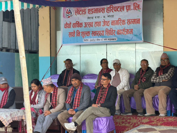 लेटाङ । लेटाङ एडभान्स हस्पिटलले चौथो वार्षिकोत्सवको अवसरमा निःशुल्क स्वास्थ्य शिविर तथा जेष्ठ नागरिक सम्मान कार्यक्रम गरेको छ । हस्पिटलले सामाजिक उत्तदायित्व निर्वाह गर्दै लेटाङ ४ स्थित हस्पिटल परिसरमा सञ्चालन गरेको निःशुल्क स्वास्थ्य शिविरमा २ सय ९२ जनाले विभिन्न स्वास्थ्य परीक्षण तथा परामर्श सेवा लिएका छन् ।
